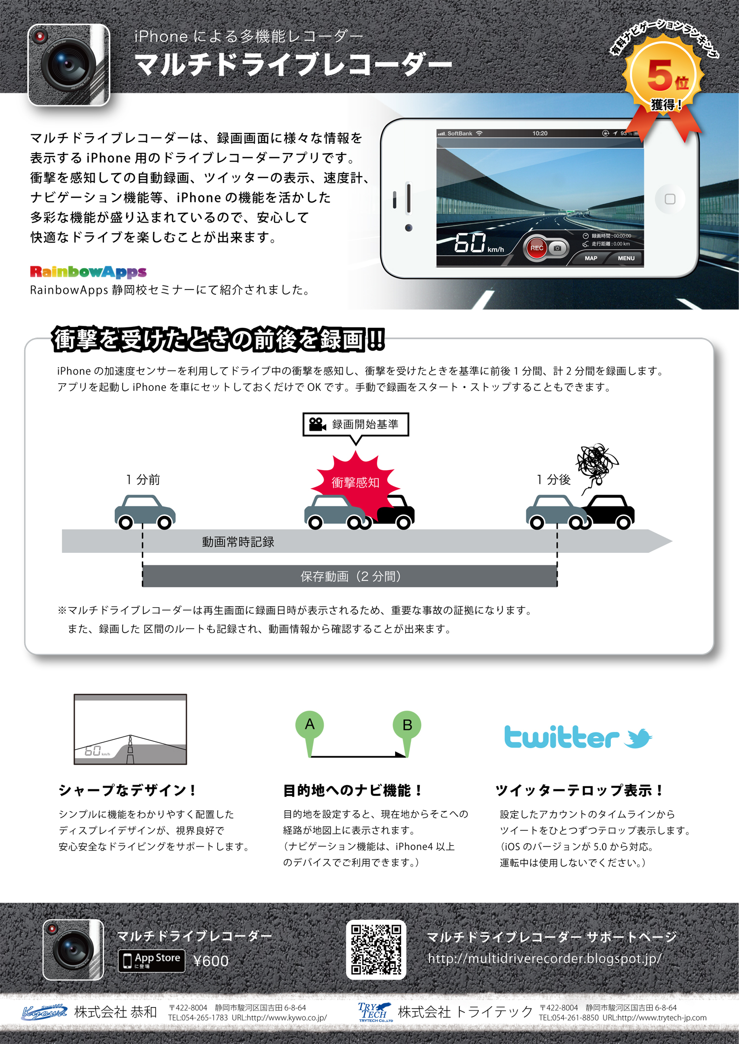 近年、交通事故の原因調査に有効な、事故時の映像を記録するドライブレコーダーの重要性が高まる中、弊社は市販品に比べて安価で、気軽に設置・導入のできるiPhoneアプリという形でドライブレコーダーを提供を始めました。「常時録画」と「自動録画」2つの録画機能で、事故の重要な証拠となり得る映像を残し、みなさまの運転に安心と安全を提供するドライブサポートアプリケーションです。