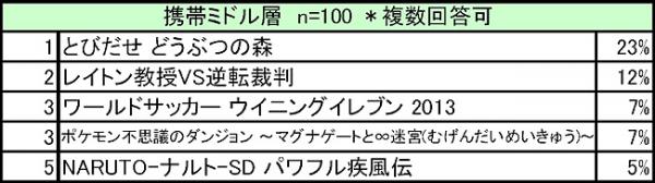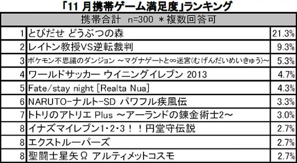 ユーザーが満足した11月発売携帯ゲームトップ3は1位「とびだせ どうぶつの森」、2位「レイトン教授VS逆転裁判」、3位「ポケモン不思議のダンジョン ~マグナゲートと∞迷宮(むげんだいめいきゅう)~」となっています。