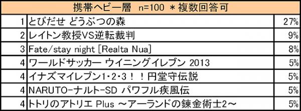 ランキングをプレイ頻度別に見てみると、どの層も「とびだせ どうぶつの森」が圧倒的人気で、ヘビー層で「Fate/stay night [Realta Nua]」が3位にランクインしている以外はさほど変わりはありませんでした。