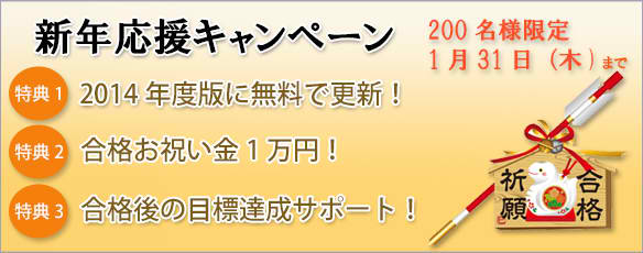 当キャンペーンでは、2014年度版の講座に無料で更新できます。そのため、万が一、今年の試験が不合格になってしまった場合でも、安心して2014年まで勉強を続けられます。これにより、2年間の試験で確実に合格を目指せます。