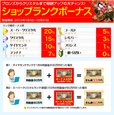 国内最大級のドロップシッピングサービスを運営する株式会社もしも(代表:実藤裕史・以下もしも)は2013年1月1日より、売上ごとに設定される会員ランクのうち「ブロンズランク」から「クリスタルランク」の通常ショップ利益金に対し、ランク別にボーナス率を設定してボーナス報酬を付与する『ショップランクボーナスキャンペーン』を開始しました。