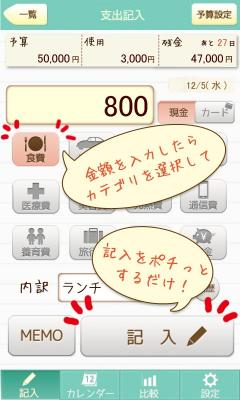面倒な家計簿の入力が説明を読まなくても、一画面でかんたんに入力していくことが出来る、便利な家計簿アプリです。