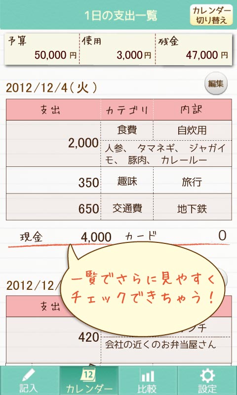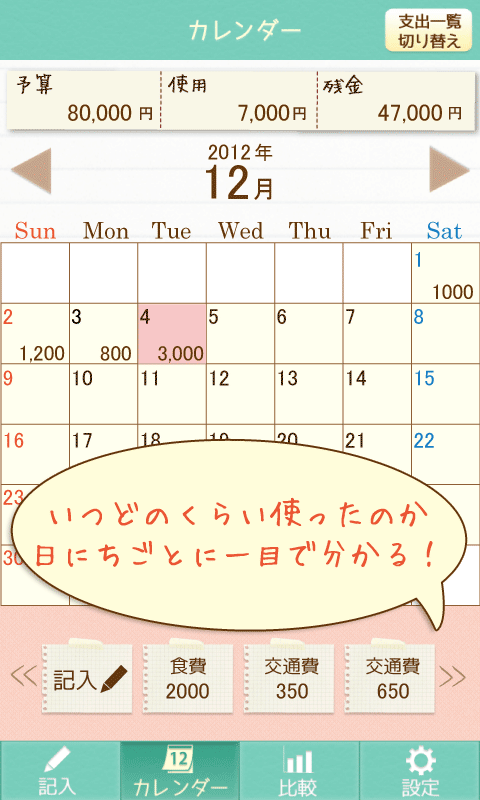 カレンダーでは、日付ごとにいくら使ったかを、ひと目で把握することが出来ます。