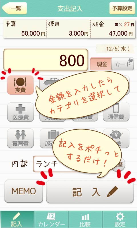 使った金額や用途だけでなく、ちょっとしたメモも一緒に残すこともできるので、忘れん坊さんでもちゃんと管理が出来ちゃいます。