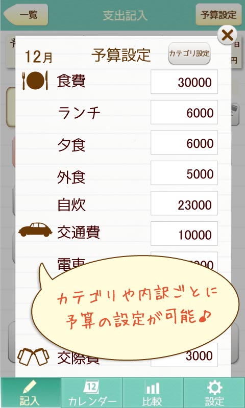 設定した支出の予算と使用の比較を、カテゴリ別でカンタンに見ることが出来ます。