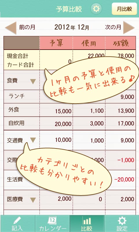 前月と使った金額を比較することも可能なので、残り日付までにいくら残っているかなども一目瞭然!