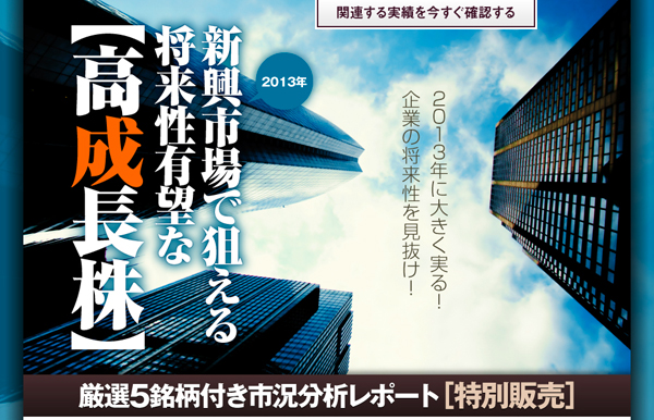 ・商品名:厳選5銘柄付き市況分析レポート「2013年・新興市場で狙える将来性有望な【高成長株】」