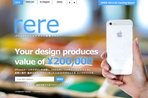 rereは、iPhoneケースのデザインを投稿し、20日以内に200件以上の注文が入ると、実際に制作・販売されて、デザイン投稿者に20万円払われる、というサイトです。