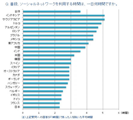 国別の平均をみると、最も利用時間が長い国はインドネシアとサウジアラビアで、ともに5.1時間であった。次いでトルコ(4.9時間)、アルゼンチン(4.7時間)、ロシア(4.6時間)が続く。反対に最も短い国は日本とフランスで、ともに2.3時間であった。