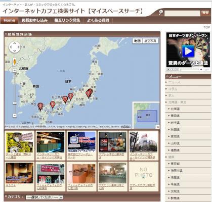 サイト閲覧者は、全国の希望地域ごとにインターネットカフェをマップ表示により、