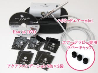 レンタルセット内容は、コンプレッサーがコンパクトな『Hollywood Air mini』と、ファンデーション5色、更にエアー圧を利用して行えるエアーテラピー専用のラバーキャップがついており、