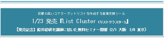 なお、『リストクラスター』の発売を記念して、中小企業の経営者を対象とした無料セミナー「成果を出している営業が必ず行っているノウハウ大公開セミナー」を大阪(2月1日)・東京(2月8日)の2会場で開催します。ゲスト講師には、株式会社船井総合研究所の経営コンサルタントである江尻氏をお招きし、2013年の時流と戦略をお話し頂きます。