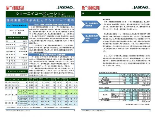13年3月期第2四半期累計(12年4~9月)の非連結業績は、売上高4,266百万円(前年同期比0.9%増)、営業利益21百万円(同20.5%減)。会社側の期初予想は、売上高4,547百万円、営業利益80百万円で、いずれも未達となった。売上高未達の主因はパッケージ事業であり・・・
