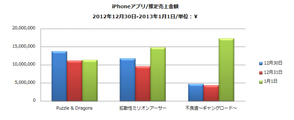 これによれば、推定売上トップはガンホー・オンライン・エンターテイメントが提供している「Puzzle & Dragons」で、この期間における累計推定売上金額は3,614万円。2012年12月30日、31日ともランキングトップを獲得し、この3日間の累計で第1位となっている。第2位はスクウェア・エニックスの「拡散性ミリオンアーサー」。その累計推定売上金額は3,605万円で、第1位の「Puzzle&Dragons」に僅差で迫っている。また第3位はアプリボットの「不良道~ギャングロード~」で、その累計推定売上金額は2,628万円。ただ1日の推定売上金額では、2013年1月1日に1,700万円を超える売上を達成し、この期間内では一日当たりの最大の売上金額となっている。