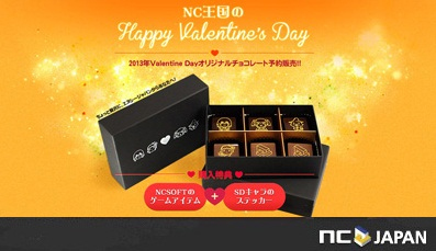 PC向けゲーム総合ポータルサイト「NCSOFT」にてオンラインゲーム『リネージュ ~Eternal Life~』、『リネージュ2 ~Goddess of Destruction~』『タワー オブ アイオン』および『真・雀龍門』をサービス・運営しているエヌ・シー・ジャパン株式会社(東京都渋谷区、代表取締役:金 澤憲(キム テクホン)以下、エヌシージャパン)は、2013年1月18日(金)正午から2012年2月3日(日)午後11時59分までの期間、「NC王国のHappy Valentine’s Day」を実施しオリジナルバレンタインチョコレート(以下、本商品)の販売受付を行います(※1)。