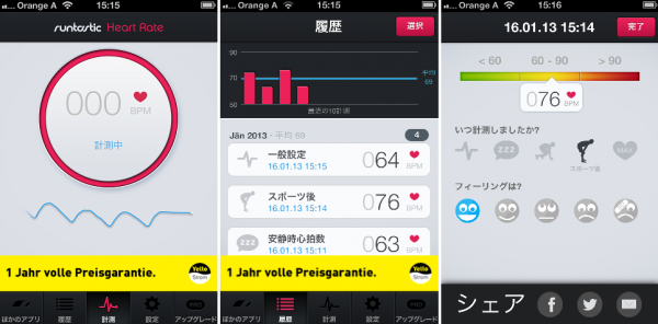 有限会社ランタスティック(本社:リンツ、オーストリア、代表取締役:Florian Gschwandtner)は、スマートフォンで心拍数が計測できるアプリ「runtastic Heart Rate」(無料版)を2013年1月24日にリリースしました。アプリを立ち上げ、スマートフォンに搭載されているライトの点灯を確認し、カメラ部分を覆うように人差し指を当てるだけで、自分の心拍数が計測できるだけではなく、以下の追加機能が利用できるようになりました。