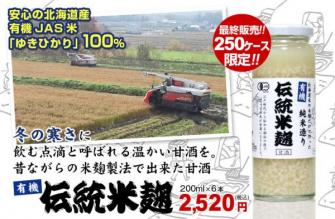 ミリオンの健康飲料シリーズのミリオン株式会社(埼玉県さいたま市)が、北海道産有機JAS米「ゆきひかり」を100%使用した「有機純米造り 伝統米麹(甘酒)」を1月23日より250ケース限定販売します。江戸時代から伝わる伝統の技で作った「米麹」だけの自然な甘さが特徴で、北海道産有機栽培米のみで作られたストレートの甘酒は当製品のみ(※当社調べ)です。甘酒には、ビタミンB1、ビタミンB2、ビタミンB6、葉酸、食物繊維、オリゴ糖や、システイン、アルギニン、グルタミンなどのアミノ酸、そして大量のブドウ糖が含まれています。これらの栄養はいわゆる栄養剤としての点滴と同じ内容であることから「飲む点滴」と呼ばれることもあるようです。健康食品メーカーである当社は、こうした甘酒の栄養分の豊富さに着目し、米麹製法を採用、さらに当製品の限定販売をします。限定250ケースとなりますのでお早めにご注文ください。温めても美味しい甘酒で寒い冬を乗り切ろう!