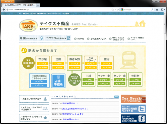テイクス不動産のモットーはオーダーメイドのお部屋探し。社長の人柄が伝わるように、コラム・Twitter・Facebookも開設し「イマドキ」のソーシャル発信も行っています。