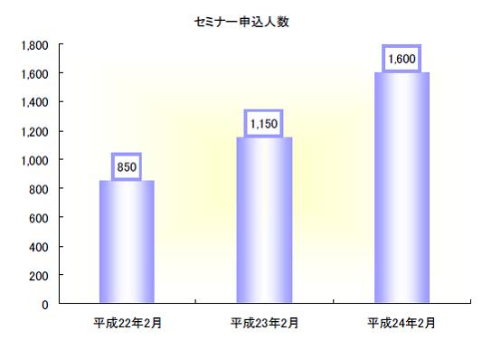 こうした状況に対応するための手法として、中堅・中小企業のM&Aは年々増加しており、仲介を手がける当社のM&A仲介実績は過去最高記録を更新しています。また定期的に開催している当セミナーの参加者は年々増加しており、2012年10~11月開催時には2,000名のお申し込みを頂きました。