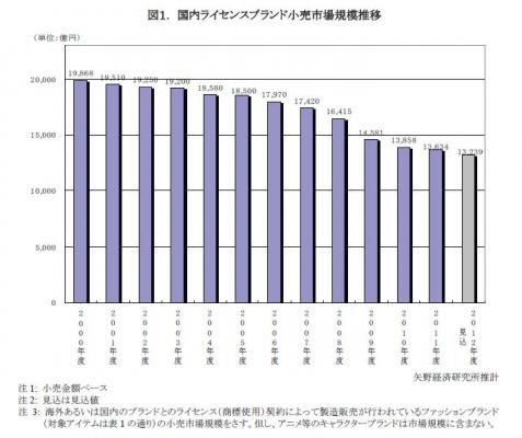 本調査におけるライセンスブランド市場とは、海外あるいは国内のブランドとのライセンス(商標使用)契約によって製造販売が行われているファッションブランド(対象アイテムは表1の通り)の小売市場規模をさす。但し、アニメ等のキャラクターブランドは市場規模に含まない。