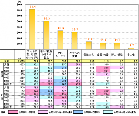 全体のトップ3は、1位「友人や家族、地域とのつながり」71.4%、2位「新しい技術や省エネ製品」50.3%、3位「笑い・ユーモア」33.6%となりました。