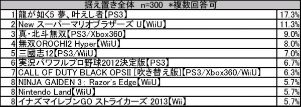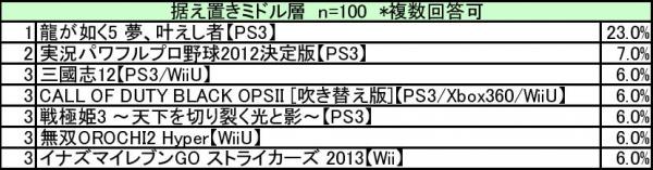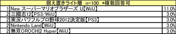 ランキングをプレイ頻度別に見てみると、ミドル・ライト層[*2]では、「実況パワフルプロ野球2012決定版」と「三國志12」がランクインしています。ライト層ではヘビー・ミドル層に人気の「龍が如く5 夢、叶えし者」がランクインしておらず、「New スーパーマリオブラザーズ U」が1位になっており、ネームバリューの高さが伺えます。