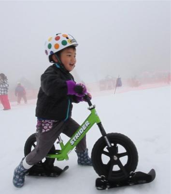 2012年12月に販売開始となった「ストライダー」用“スキーアタッチメント”。この“スノーストライダー”のレンタルをコースに用意。コース幅7メートル・全長150メートルの専用コースは、アップダウンもあり本格的なコースとなっています。