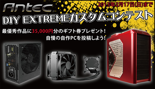 参加応募方法は下記の応募条件に同意の上、自作PCパーツの総合コミュニティサイトDIY EXTREMEのギャラリーに投稿していただくことで応募とさせていただきます。また、すでに投稿されている対象のAntec社製のPCケース、電源ユニット、水冷一体型クーラーのいずれかを使用した作品につきましては、応募済み作品とし選考対象とさせていただきます。受付期間は、2013年2月17日(日)までに投稿されている作品が選考対象となります。