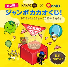 オンラインショッピングモールQoo10を運営している、ジオシス合同会社(本社:シンガポール)は、2013年1月23日(水)、Qoo10×カカオトークではコラボ企画「ジャンボカカオくじ」キャンペーンを開始致します。