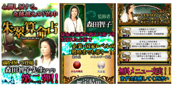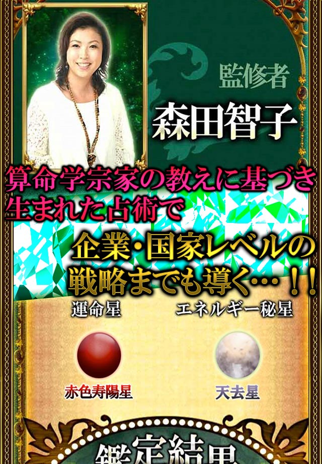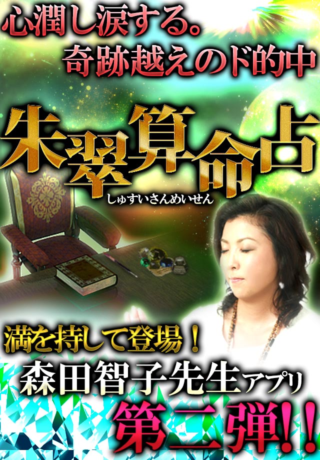 本アプリは、元気になれました。希望が持てました。心癒され涙する奇跡越えのド的中鑑定「森田智子」の朱翠算命占術を用いた占いアプリです。前世までを視ぬき、心の底まで癒される。この奇跡を超えた超的中占いをお試し下さい。