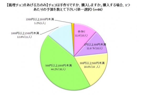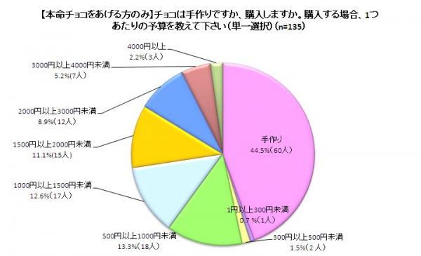 「チョコは手作りですか、購入しますか。購入する場合、1つあたりの予算を教えて下さい(単一選択)」という質問には、『本命には手作り』と回答した人が44.5%に対し、『義理チョコを手作りする』と回答した人は11.6%でした。また、購入金額に関しては、本命チョコでは金額にばらつきがあり、義理チョコでは1500円未満と回答した人が多く、その中でも500円以上1000円未満の予算でチョコを購入する人が44.2%と多い事がわかりました。