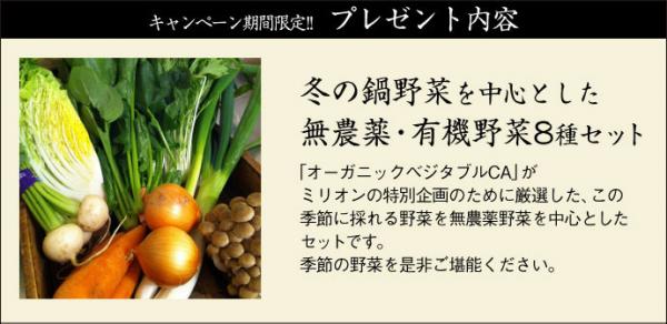 期間中にミリオン株式会社のECサイト「ミリオンストア」で“ミリオンの健康飲料シリーズ”の定期コース契約をしていただいたお客様へ、“京都産を中心にした冬野菜の無農薬・有機野菜8種セット” をもれなくプレゼントします!(提供:株式会社GA http://shop.ovca.jp/)。暖かいお鍋料理に最適な冬野菜をチョイスしております。