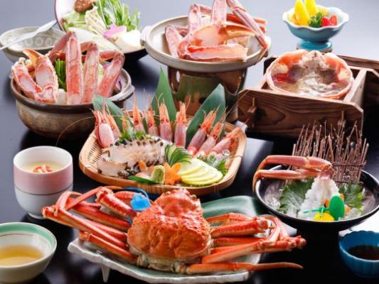 カニ刺しに間人(たいざ)蟹、その他のカニ料理には山陰沖の地蟹を使用した贅沢なプランです。おひとり様、約2杯半分のカニをさまざまなお料理でお楽しみいただけます。