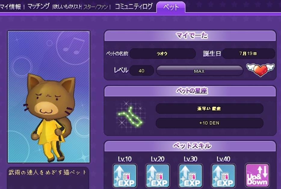 日が誕生日なのかな……? 一番気になるのが、右下に見える“ペットスキル”だよね。LV10からLV40まで段階があるみたいだし、“EXP”ってことは、ひょっとして経験値が上がるのかな!?
