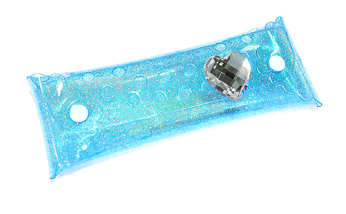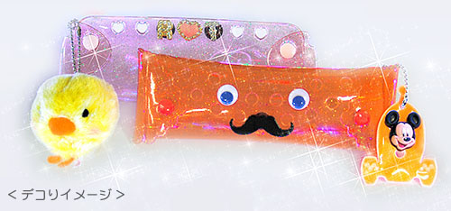 <デコペンケース(クリアバージョン)>は塩ビ素材に穴を開けることで市販のシューチャームやアクセサリー、マスコットなどを自由に付け替えられることを可能にした新発想のペンケースです。