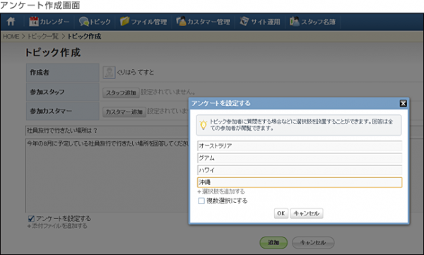 新バージョン1.3.0では、選択肢をチェックして回答するセレクト形式のアンケートを容易に設定できる「簡易アンケート機能」をトピック(※1)に追加し、既読確認、出欠確認、また会員アンケートなど、社内外のスムーズな確認、意見収集を可能にします。また、「独自ドメイン機能」の搭載により、CMS機能で作成したWebサイトの独自ドメインでの公開を実現します。