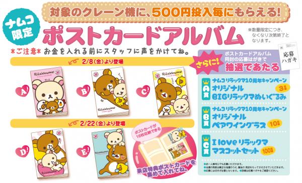 キャンペーン実施店舗では、対象のクレーンゲーム機に500円投入毎に、ナムコ限定「ポストカードアルバム」(全5種・数量限定)を1冊プレゼントします。さらに、期間中ご来店いただいた方に先着で、毎週新しいデザインが登場するポストカード(お一人様1日1枚・なくなり次第終了)を配布します。