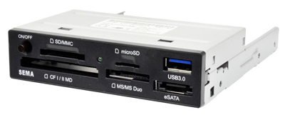 SFD-321F/T81UEJRは、最大転送速度5Gbps USB 3.0に対応した3.5インチベイ内蔵型カードリーダーです。SDXCやSDHC規格のUHS-I転送モード、ハイエンドコンパクトフラッシュに採用されるUDMAモード6に対応するRealtek社の高速コントローラIC RTS5301を搭載しています。内部接続によりケースフロントにUSB 3.0、eSATAポートを引き出し、高速転送を実現するSDXCやSDHC等の大容量メディア、人気のコンパクトフラッシュやメモリースティックなど多彩なメディアデータの操作を可能にします。最新のMicrosoft OS Windows 8に完全対応、ドライブの目隠しに便利なON/OFFスイッチを搭載、全スロットのカード挿入、同時認識、読み取りと書き込みを実現します。