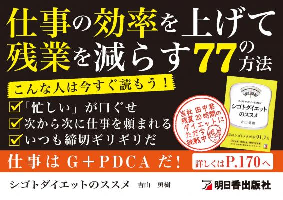 (有)明日香出版社(東京都文京区水道、代表取締役石野栄一)は、1月23日、新著『シゴトダイエットのススメ』(吉山勇樹著、1470円)を発売しました。