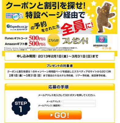 内容:クーポンと割引を探せ!のキャンペーン用特設ページを経由しエクスペディアのサイトからホテル予約、ツアー予約、航空券予約をした方へ500円分のAmazonギフト券かiTunesデジタルコードをプレゼント