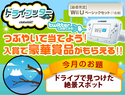 抽選対象者:お題「ドライブで見つけた絶景スポット」を、キャンペーンサイトのツイッターフォームからつぶやいていただき、その上で応募フォームからご応募いただいた方