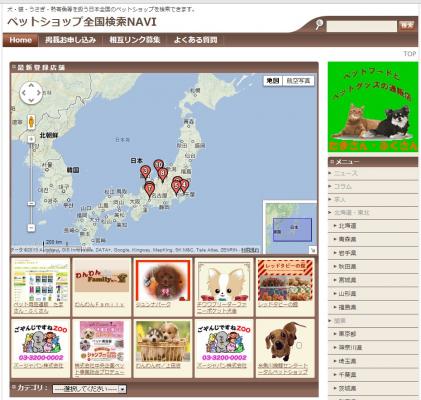サイト閲覧者は、全国の希望地域ごとに全国のペットショップをマップ表示により、