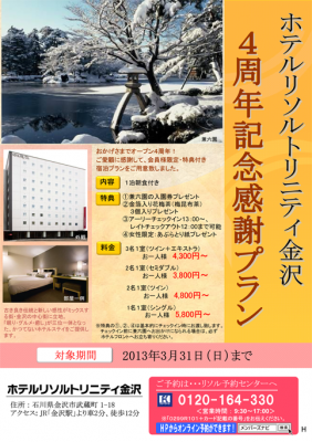 <「ホテルリソルトリニティ金沢」4周年記念感謝プラン(1泊朝食付)>