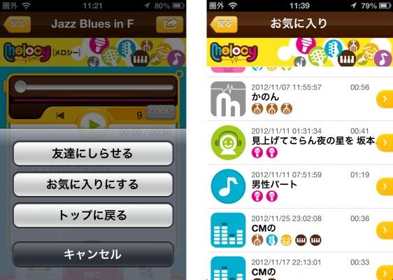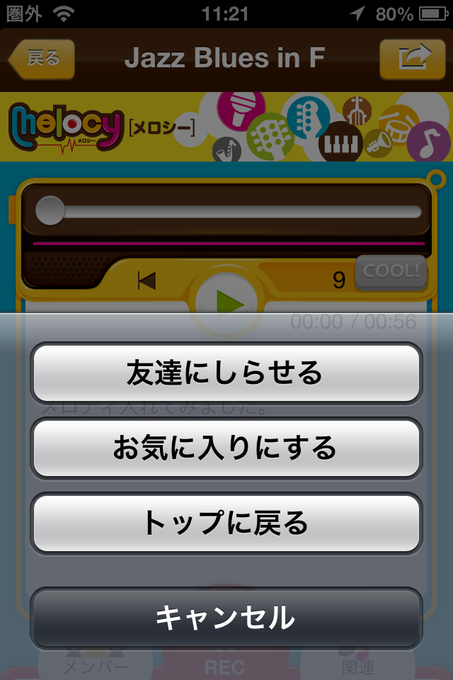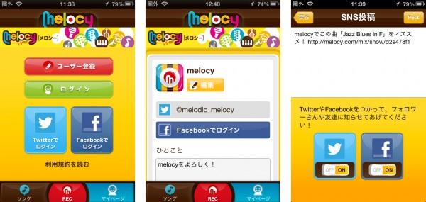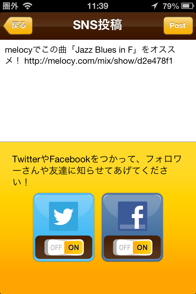 演奏した曲の公開やお気に入りへの追加など、melocyでのアクションをSNSを通じて友達に広めることができます。