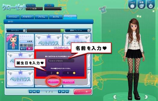 名前と誕生日の登録画面がでたら、ペットに素敵な名前と誕生日をつけてあげてね!