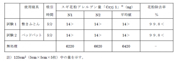 結果は花粉除去率99%以上と、敷きふとんおよびベッドパットに付着した花粉をほとんど除去できる数値がでました。