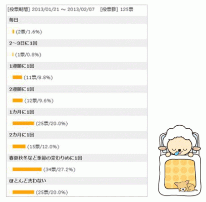 『ねむログ』会員ユーザーおよそ35,000名のうち125名に対して、「現在、かけぶとんカバーを洗う頻度はどのくらいですか?」という質問に対する回答を、8つの回答(「毎日」、「2~3日に1回」、「1週間に1回」、「2週間に1回」、「1カ月に1回」、「2カ月に1回」、「春夏秋冬など季節の変わりめに1回」、「ほとんど洗わない」)から選択してもらう