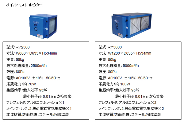 「リドエアートルネックス」のオイル・ミストコレクター RY2500、RY5000は、調理時に発生する油分を最大効率 95%、最小粒子径0.01μmから集塵します。