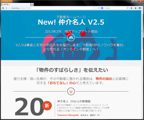 仲介名人(運営:株式会社ショーケース・ティービー)は、この度、最新のWeb技術を使用し最適なユーザ体験を提供するべく、20を超える機能を刷新したバージョン2.5をリリースしました。(2013年2月19日)