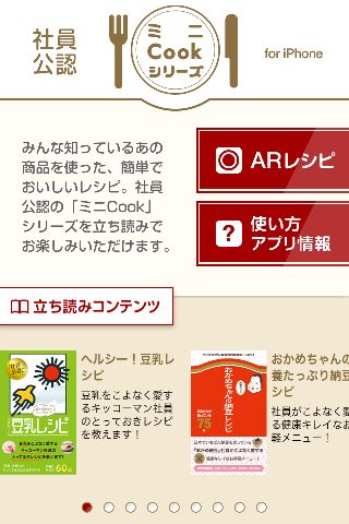 さらに書籍の購入者への特典として、AR(拡張現実)技術を活用し、日替わりレシピを配信いたします。アプリを起動し、ミニCookシリーズ対象書籍の表紙にiPhoneをかざすと、シリーズに収録されたレシピの中から日替わりで朝昼夜3食のおすすめレシピを見ることができます。